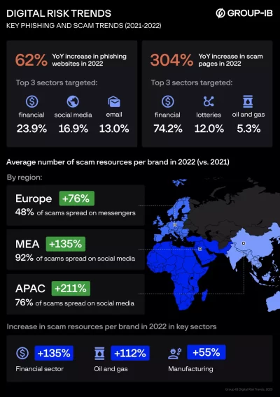 En general, Group-IB detectó un 304% más de recursos de estafa que utilizaron el nombre y la imagen de marcas legítimas en 2022 en comparación con el año anterior.