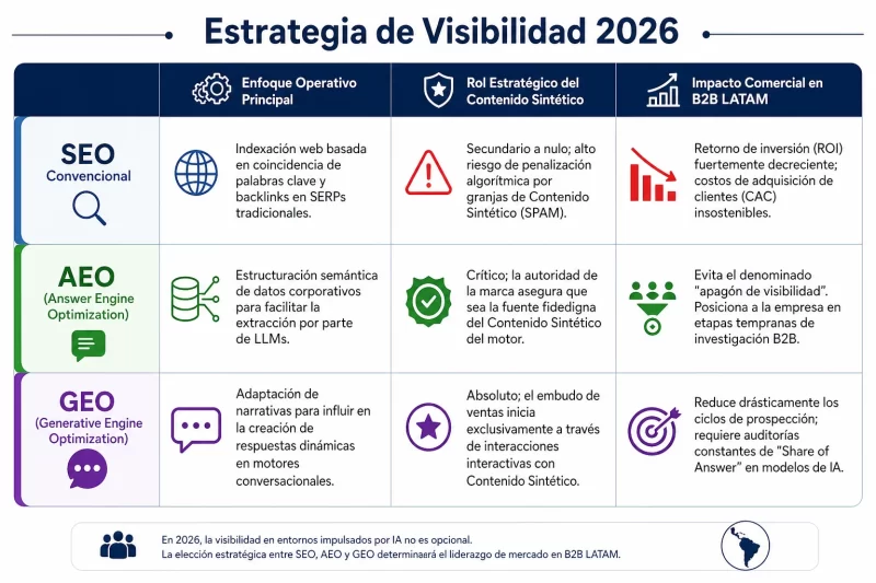 Ante esta amenaza de invisibilidad digital, la supervivencia de las corporaciones latinoamericanas depende ahora de inversiones masivas en AEO (Answer Engine Optimization) y GEO (Generative Engine Optimization).