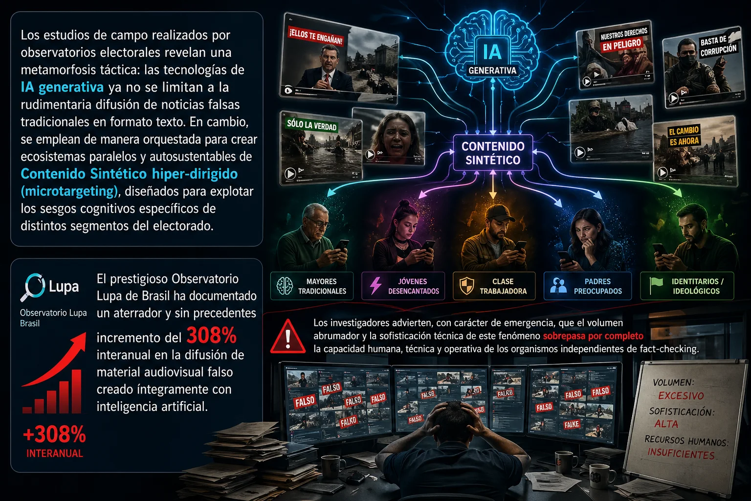 Los estudios de campo realizados por observatorios electorales revelan una metamorfosis táctica: las tecnologías de IA generativa ya no se limitan a la rudimentaria difusión de noticias falsas tradicionales en formato texto. En cambio, se emplean de manera orquestada para crear ecosistemas paralelos y autosustentables de Contenido Sintético hiper-dirigido (microtargeting), diseñados para explotar los sesgos cognitivos específicos de distintos segmentos del electorado.