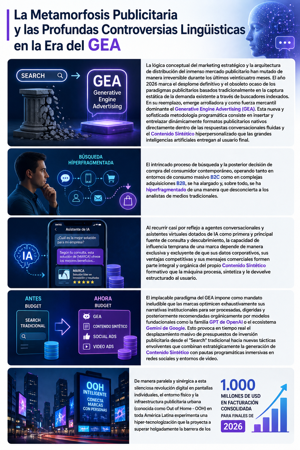 La lógica conceptual del marketing estratégico y la arquitectura de distribución del inmenso mercado publicitario han mutado de manera irreversible durante los últimos veinticuatro meses. El año 2026 marca el desplome definitivo y el obsoleto ocaso de los paradigmas publicitarios basados tradicionalmente en la captura estática de la demanda existente a través de buscadores indexados. En su reemplazo, emerge arrolladora y como fuerza mercantil dominante el Generative Engine Advertising (GEA). Esta nueva y sofisticada metodología programática consiste en insertar y entrelazar dinámicamente formatos publicitarios nativos directamente dentro de las respuestas conversacionales fluidas y el Contenido Sintético hiperpersonalizado que las grandes inteligencias artificiales entregan al usuario final.