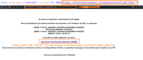 La infección comienza con un correo electrónico de phishing relacionado con el impuesto sobre la renta escrito en español, disfrazado de notificación de recibo de impuestos e incitando a los usuarios a abrir el archivo HTML malicioso adjunto.