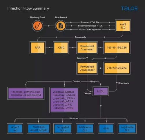 Talos descubrió que el atacante en esta campaña está utilizando múltiples hosts, incluida una instancia de Elastic Compute Cloud (EC2) de Amazon Web Services (AWS), a la que se accede a través de su URL pública, para alojar los archivos maliciosos.